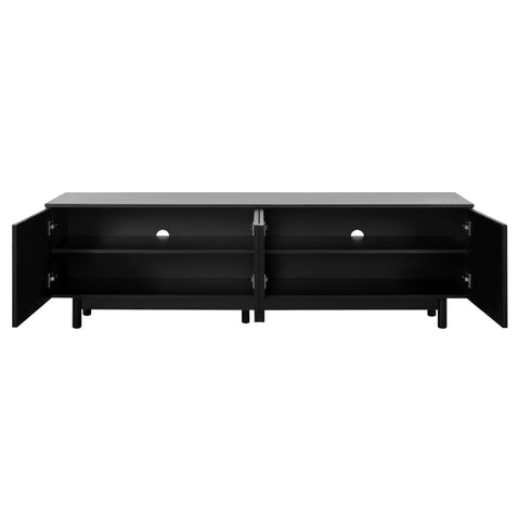 The TV stand offers ample storage space with a spacious tabletop and adjustable shelves inside. The tabletop is perfect for displaying media devices or decorative items, while the adjustable shelves allow you to customize the storage space according to your needs.