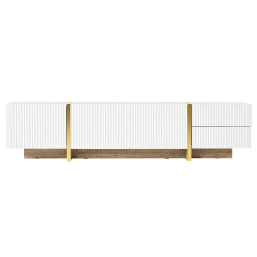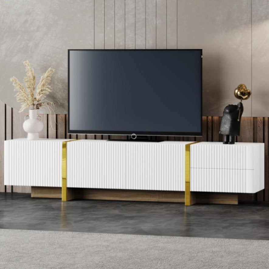 Featuring smooth fluted panels and golden wood grain legs, this TV stand emanates a luxurious elegance that harmoniously complements a wide range of modern furniture styles.