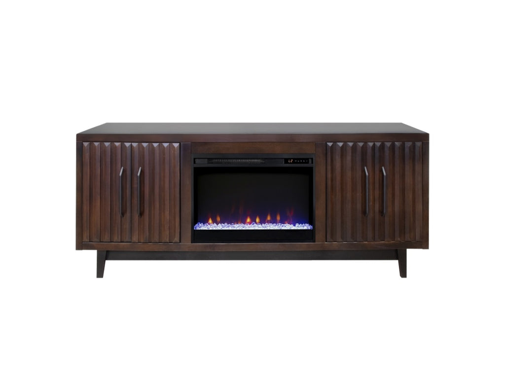 Sophisticated, modern style doesn't get better than the Radiance 75 inch Fireplace TV Stand. Artfully crafted from Poplar Solids and Okume Veneers, this showstopping Entertainment Center with Fireplace is available in two rich finishes and includes Matte Black Hardware. The large cabinet rests atop a sleek wood base with tapered legs and will accommodate TVs up to 85 inches. Two stunning fluted doors conceal interior shelving for media and gaming consoles and more. Cable management openings on the back panel will keep all cords and wires organized an out of sight. The 26” Electric Fireplace Insert includes a remote control and multiple settings allow for heat up to 400 square feet. Four (included) screws make securing the fireplace insert to the console quick and simple. Pair with the matching Bookcase Pier Cabinets to create a complete Entertainment Wall.