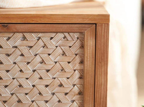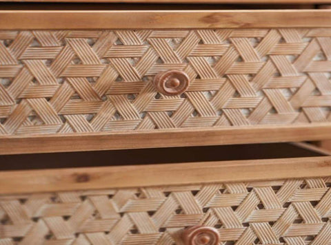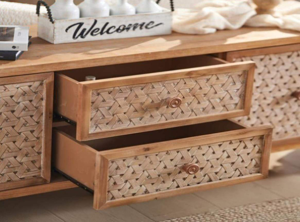 5 solid wood feet give this rattan tv console a strong support. And the 2 adjustable feet can be adjusted to keep balance on uneven floors. The overall body adopts sturdy P2 particleboard, so this TV stand is a long-time investment