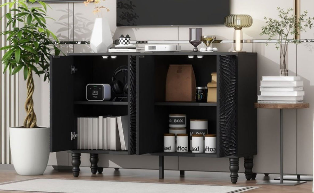 Including 2 spacious cabinets and cabinets, you will find two adjustable shelves, offering three different height options and multiple storage solutions. This flexibility allows you to customize the interior according to your storage needs. Whether you need space to place taller electronic devices such as gaming consoles or sound systems, or smaller items such as DVDs, books, and decorations, adjustable shelves can easily create the perfect configuration.