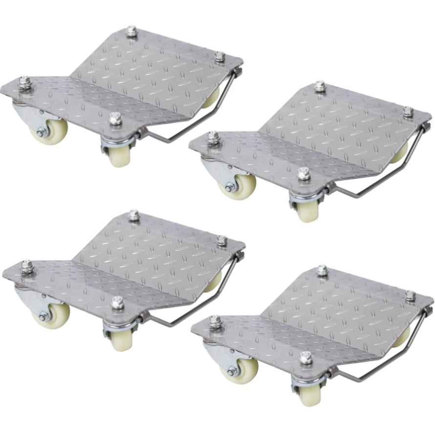 Four piece set of heavy duty vehicle dollies , each with 4 swivel casters, 2 with brakes