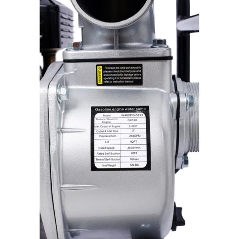 Water Pump 3" 264Gpm ,163cc Honda GX160 Engine, 3IN NPT COUPLER WITH 25FT FLAT HOSE W465P245722