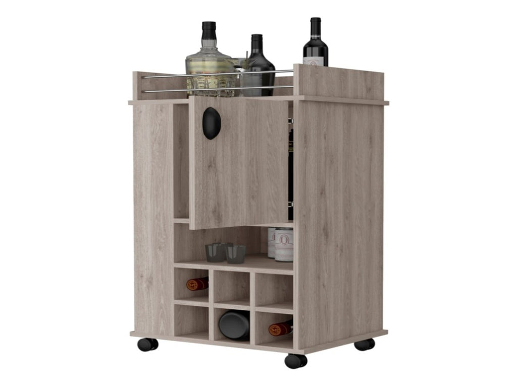 Elevate your gatherings with the exquisite Bar Cart, featuring a spacious upper surface for mixing cocktails and displaying spirits. With two side shelves for showcasing bottles and glassware, along with a single-door cabinet for additional storage, it keeps your bar essentials organized and impressive.