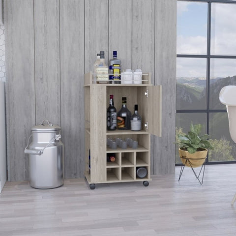 The Fargo Bar Cart features a single door cabinet with interior storage, offering ample space for glassware, mixers, or other bar essentials, ensuring a well-stocked and clutter-free home bar.