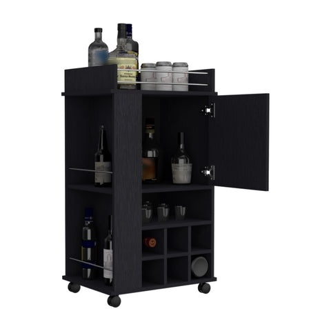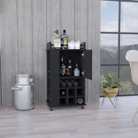 The Fargo Bar Cart features a single door cabinet with interior storage, offering ample space for glassware, mixers, or other bar essentials, ensuring a well-stocked and clutter-free home bar.