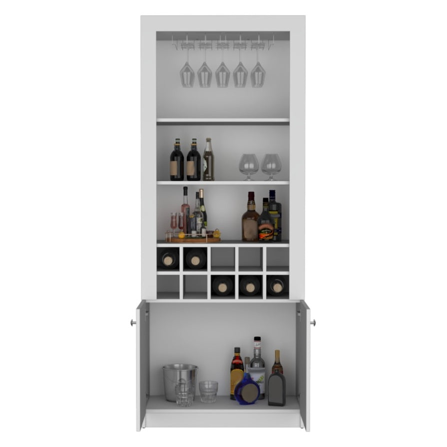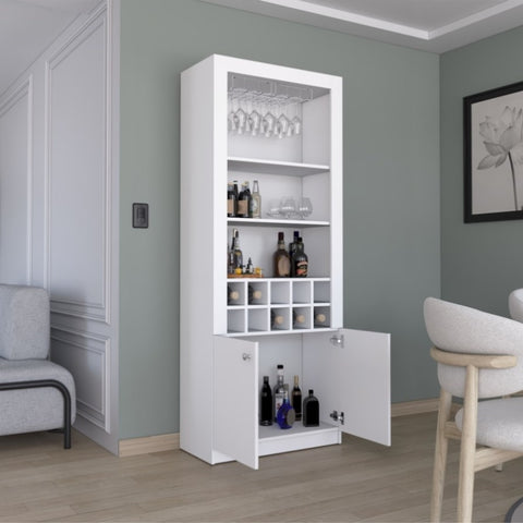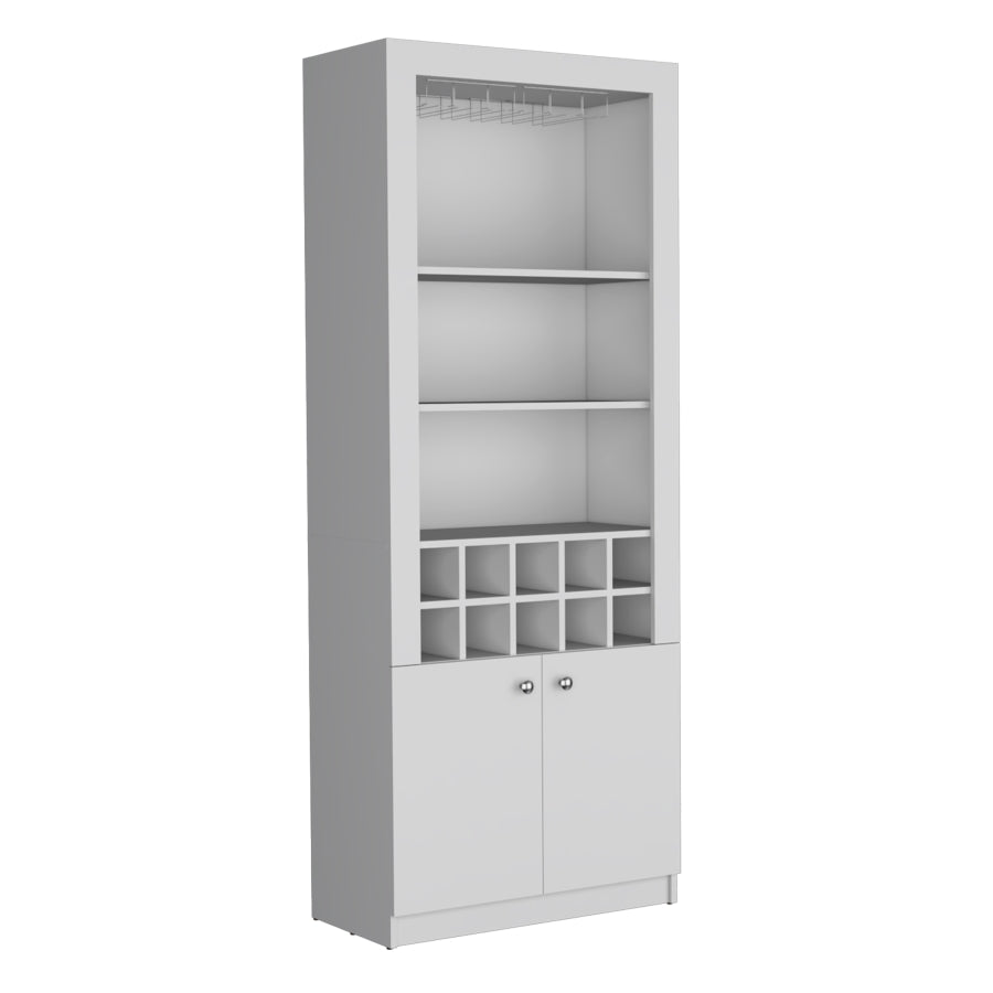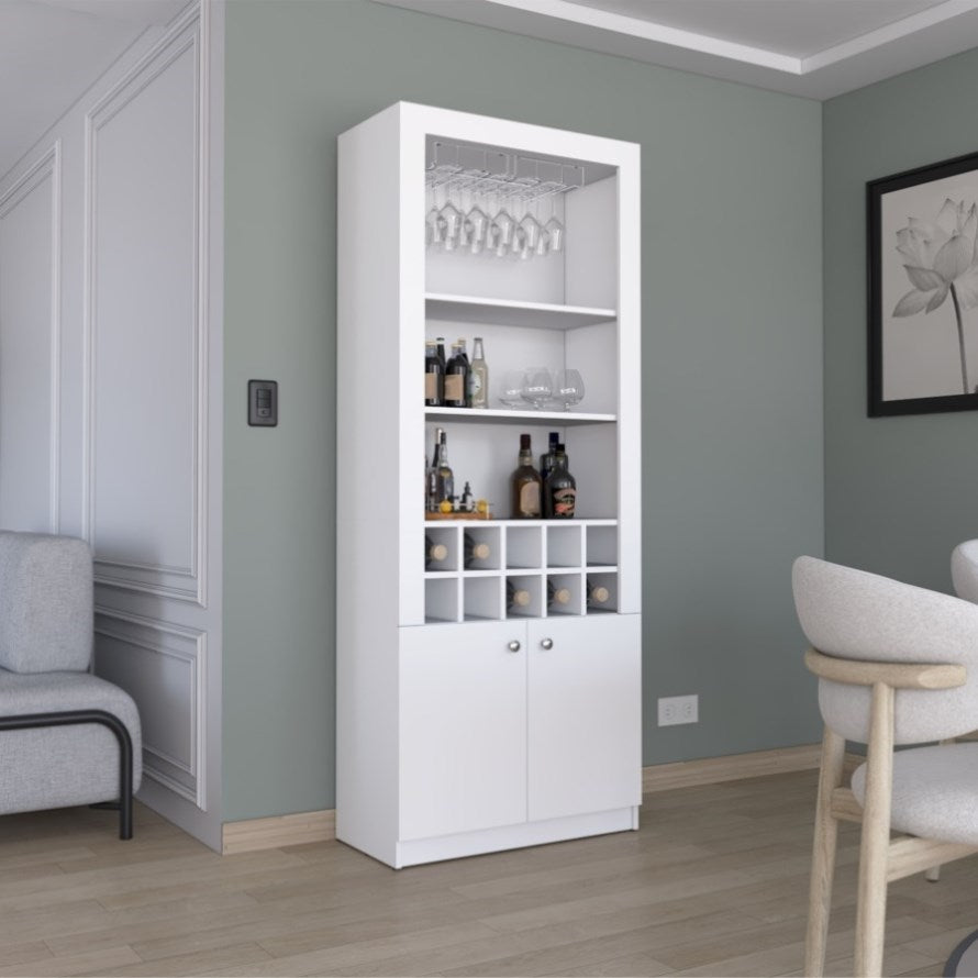 Ample Storage Space: This cabinet composed of lower double door cabinet . The mid section features a bottle cubbie rack, and the top includes 3 shelves and a 6 line stemware rack , This storage space allows you to cstore all type of items, like kitchen utensils, jars, snacks, liquor orderly.