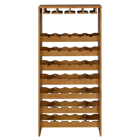 This wine rack, adorned with a warm oak finish, infuses elegance and natural beauty into your space with seven racks capable of storing up to 35 bottles of wine. Additionally, it comes equipped with four stemware racks for hanging and displaying wine glasses, presenting a compact and space-efficient solution perfect for small apartments, kitchens, or dining areas.