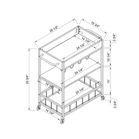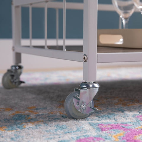 Add storage space to your kitchen with this metal frame kitchen cart featuring heavy duty rubber locking wheels, a wine bottle rack, and enclosed shelves. Finished on all side, the metal bar acts as a cart handle as well as a towel rod. Wine bottle rack holds up to four wine bottles. The enclosed shelves keep items from falling off when cart is mobile.