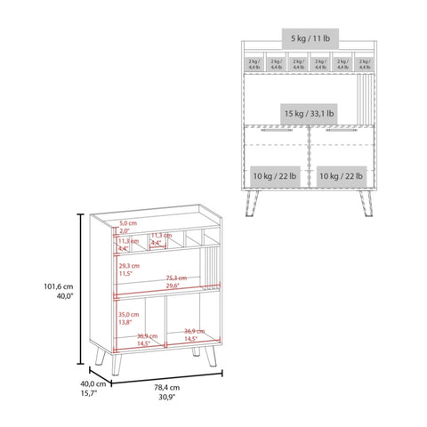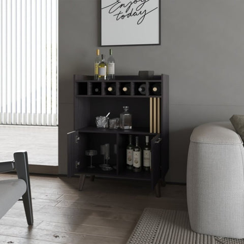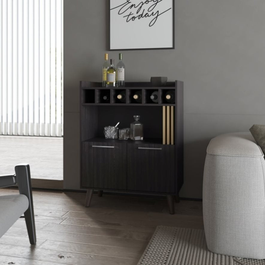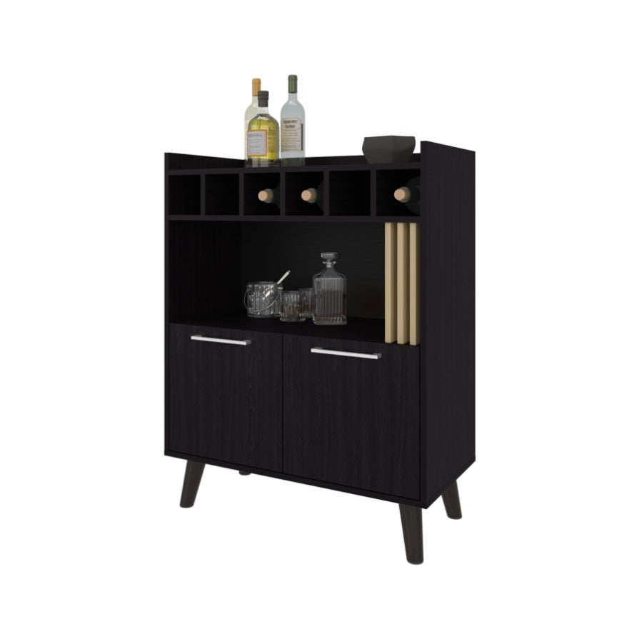 "Elegant bar cabinet designed to complement any living room or dining area. This piece features an upper shelf for bottles and glasses, along with individual spaces to store up to five wine bottles horizontally, preserving their quality. It also includes an open shelf, perfect for displaying glassware and bar accessories, and two lower doors that provide additional storage for bottles, utensils, or other items. Its conical legs add a modern and stable touch, making it the focal point of any social space in the home