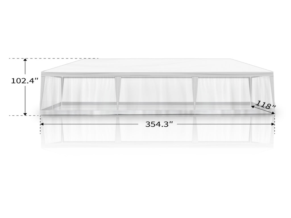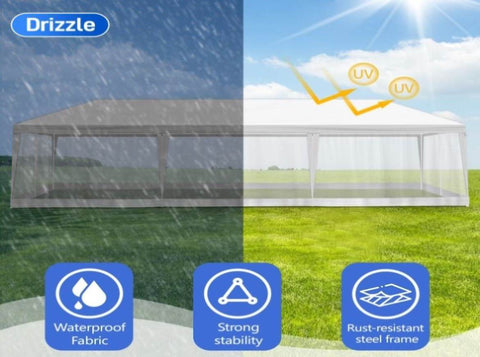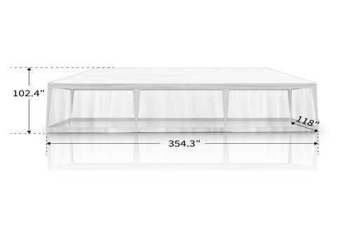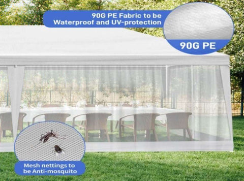 Take such a practical 10X30FT tent for daily use! It will provide you with happy time in the open air! The top canopy is made of 90G PE fabric, which is waterproof and is a great sun-coverage solution, and the 8 meshing netting sidewalls protect you from insects and mosquitoes to makes it extremely fit for outdoor activities. In addition, this party tent come with great durability and reliability. It is easy for installation and disassembly! Do have a try with our Tent, Set it up on your lawn or on your patio, and get ready to enjoy delightful outdoor life!