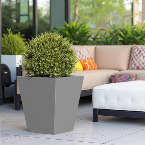 The 18" H Tall Tapered Planter is a striking addition to any home or patio decor. Its burnished grey finish adds a touch of elegance while complementing various interior and exterior styles, making it a perfect focal point in any setting.