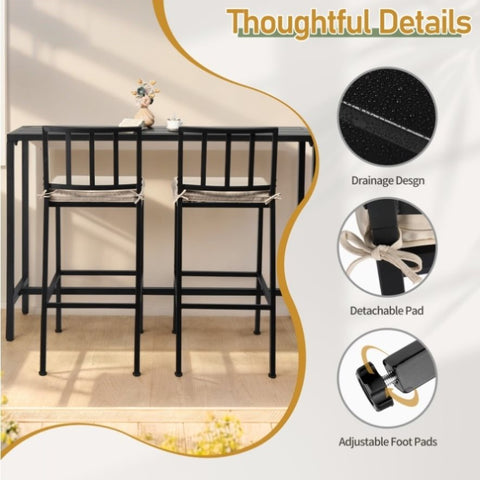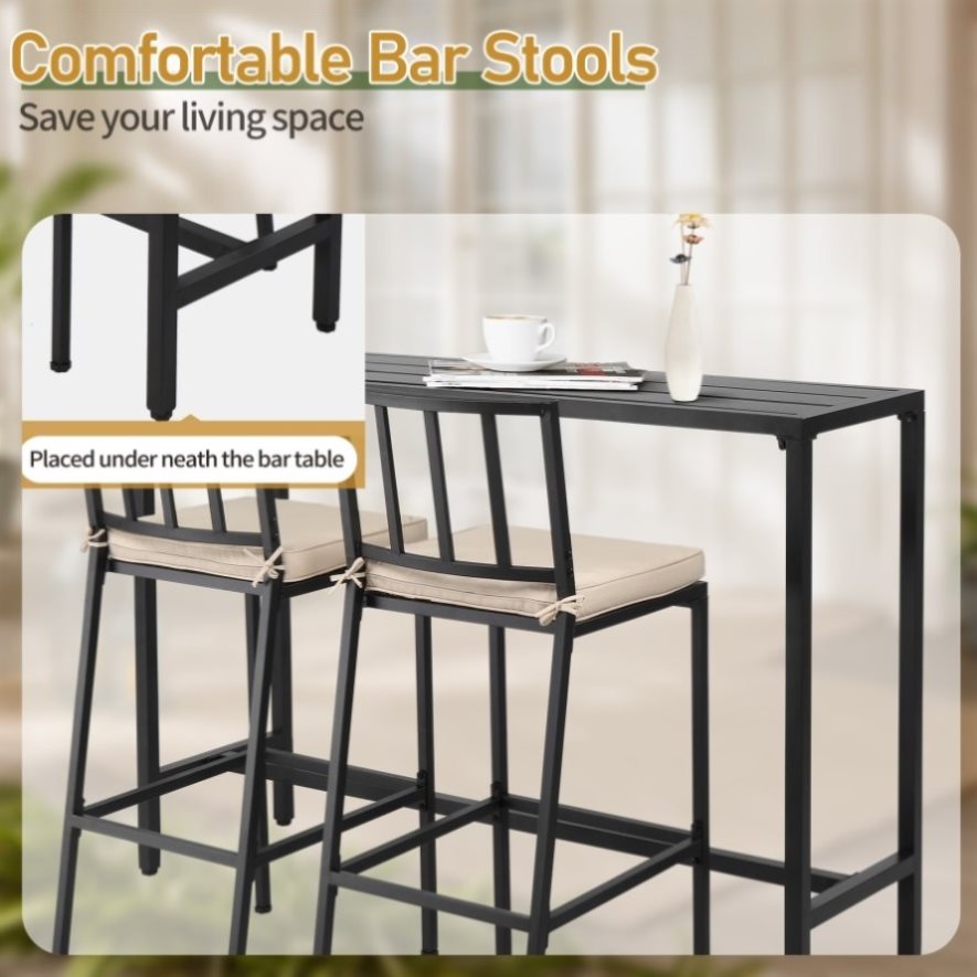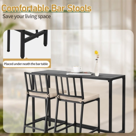 Upgrade your outdoor space with this stylish and functional 3-piece patio bar set. The set includes a spacious rectangular high-top bar table and two comfortable bar stools, perfect for relaxing with family and friends. Ideal for balconies, patios, decks, or poolside areas, this bar set is designed to bring both convenience and elegance to your outdoor gatherings. Built with durable, rust-resistant metal and soft, removable cushions, this set offers long-lasting comfort and versatility for any outdoor or indoor setting.