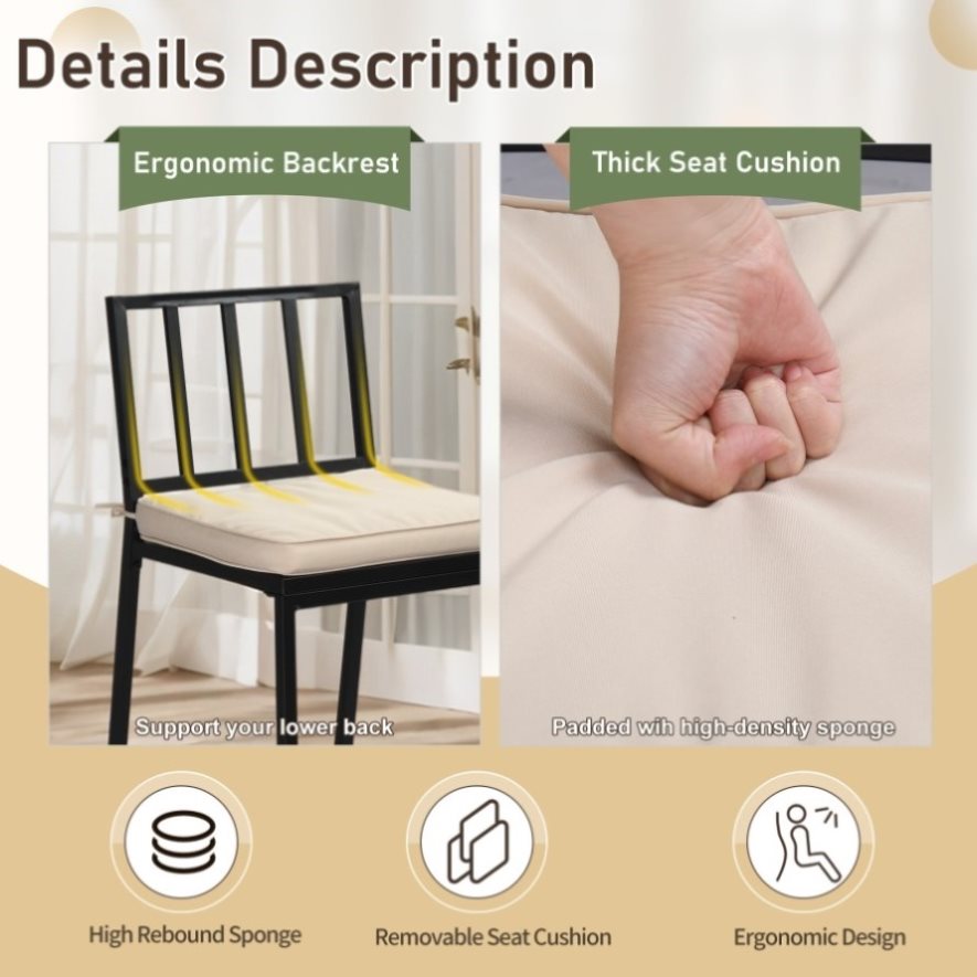 3. Comfortable Cushioned Bar Stools: Enjoy long hours of comfort with thick, plush cushions. The zippered cushion covers are machine washable and come with secure straps to prevent slipping, while the built-in footrest offers added relaxation.