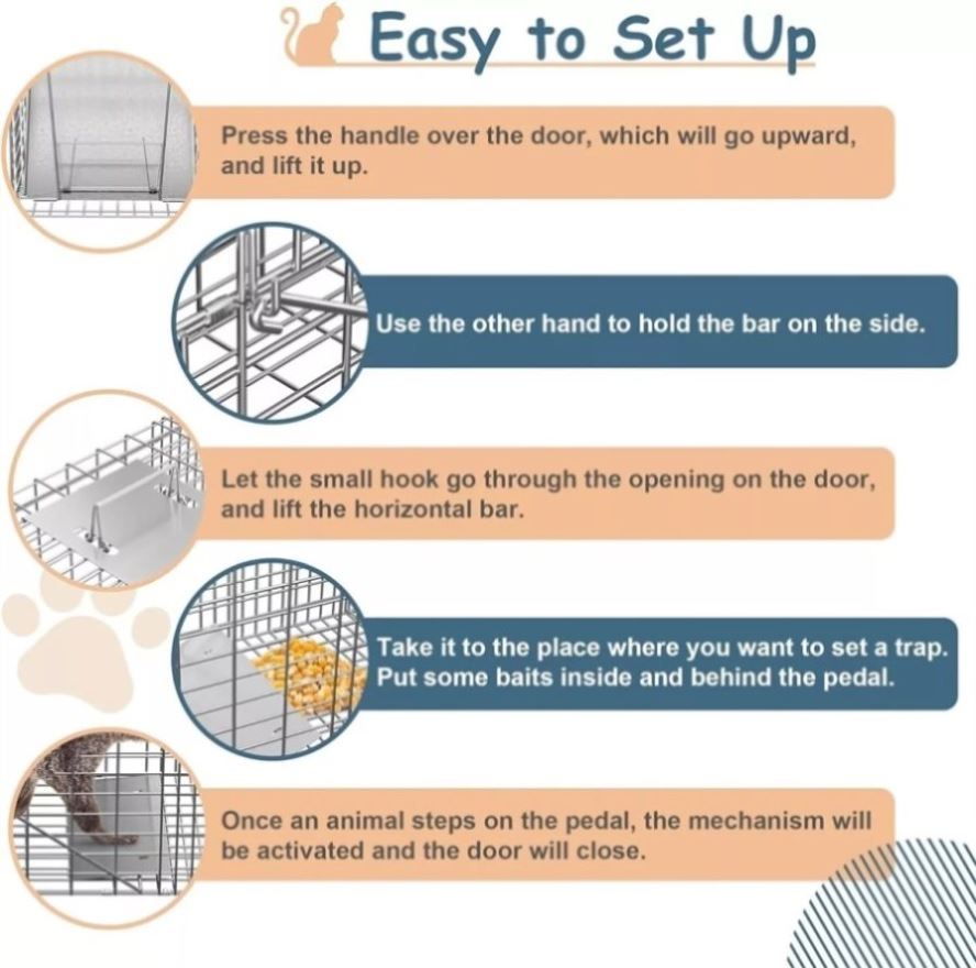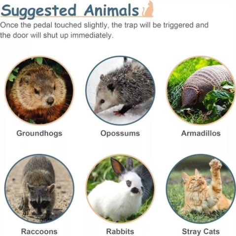 ● High Sensitive Structure : Loaded door and sensitive triggers make it ideal for humanely capturing raccoons, stray cats, groundhogs (woodchucks), opossums, armadillos and similar-size nuisance animals. Once the pedal touched slightly, the trap will be triggered and the door will shut up immediately. It ensures the trapped animal no way to escape