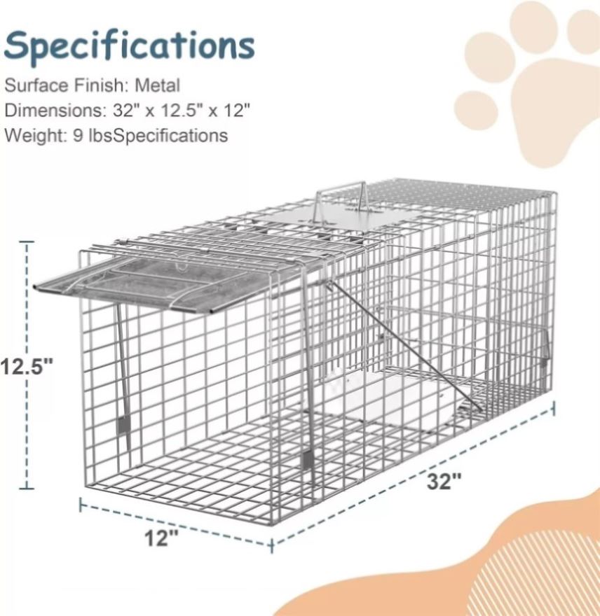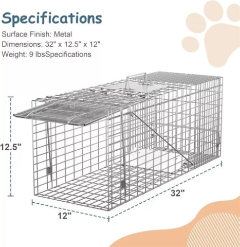 ● 32" X 12.5" X 12" Cage Trap : live animal trap cage is good ideal designed for trapping raccons, opossums, cats, rabbits, and other similar-sized undesired animals, relocate or rescue streetwise wild animals. Solid door and large handle guard offers protection during transportation