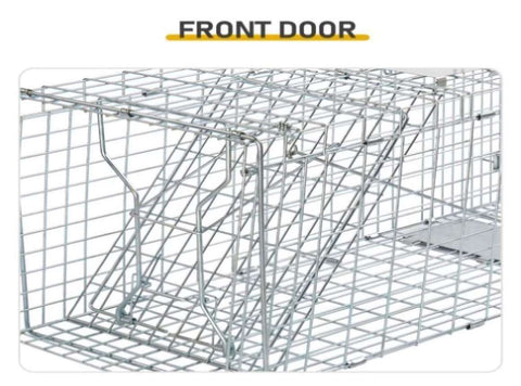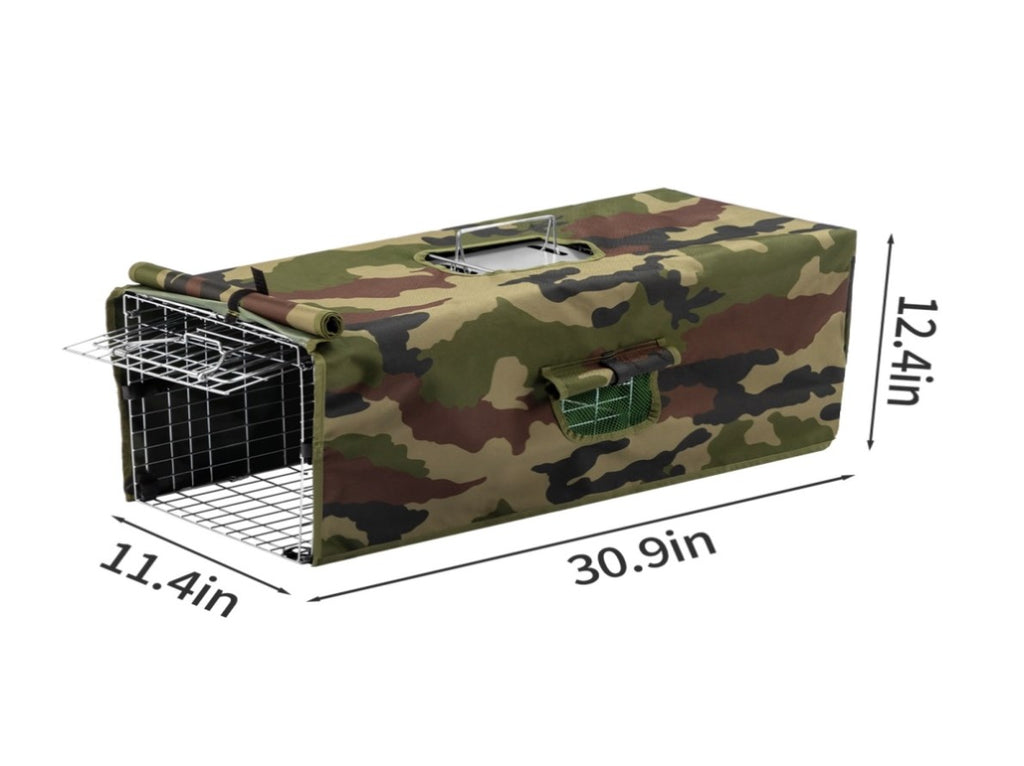 This 32-inch live animal trap cage with a removable weatherproof cover is designed for safe, humane trapping of medium-sized nuisance animals like raccoons, opossums, cats, and groundhogs. Its durable iron frame and secure mesh structure ensure reliability outdoors, while the included Oxford fabric cover helps conceal the trap, increasing capture effectiveness and offering comfort and protection to the trapped animal. Ideal for humane animal rescue and relocation.