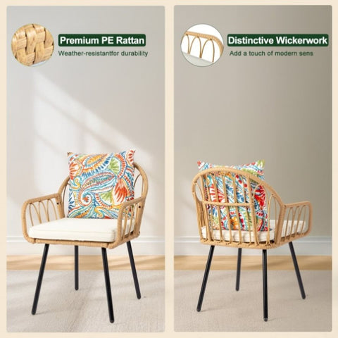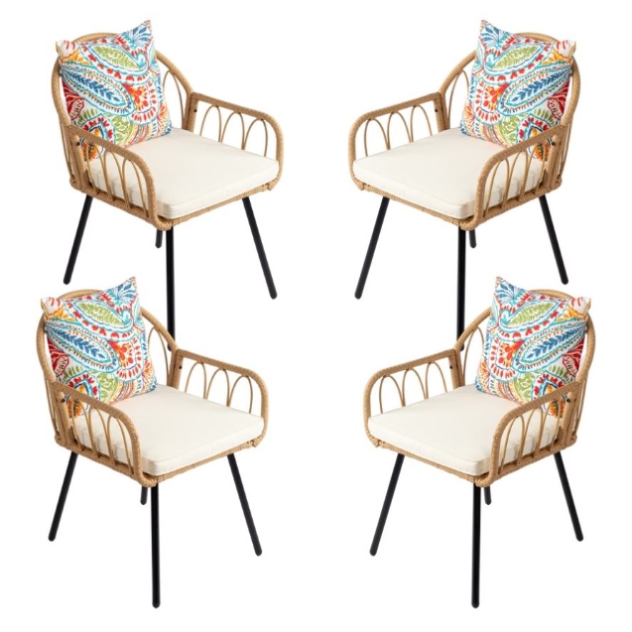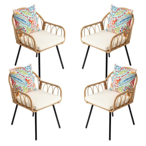 Bring comfort and bohemian charm to your outdoor space with this 4 Pieces Patio Dining Chair Set. Featuring handwoven wicker and vibrant paisley-patterned cushions, these chairs add a natural aesthetic and tropical flair to any patio, garden, or balcony. The ergonomic design supports your back, waist, and arms, making them ideal for relaxing after a long day. Crafted with a sturdy steel frame and all-weather rattan, these chairs are built to withstand the elements. The thick, breathable cushions come with zippered covers for easy cleaning.