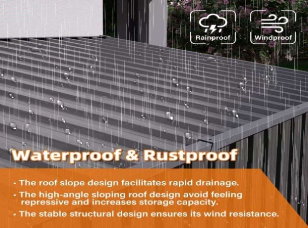 Smart Sloped Roof: Say goodbye to water damage worries! The sloped roof design efficiently channels rainwater off, preventing it from pooling and adding unnecessary weight. This keeps your shed intact and protected through every season.