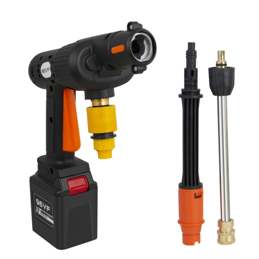 This wireless car washing machine is equipped with two water gun tubes, namely an adjustable integrated plastic water gun tube and a stainless steel water gun tube.