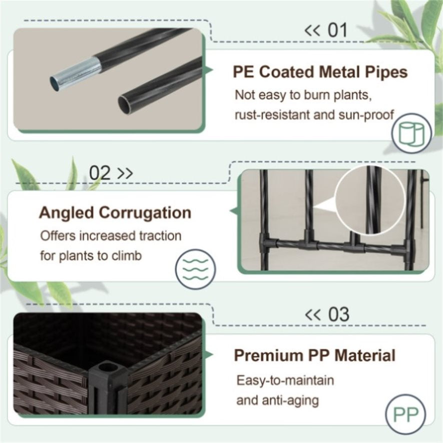 ● Upgraded Structure & Selected Materials: The arch arbor boasts metal pipes with PE coating, ensuring plants are shielded from scalding temperatures and resistance against rust for a prolonged lifespan. The planters are mainly crafted from premium PP materials, known for their easy maintenance and high strength.