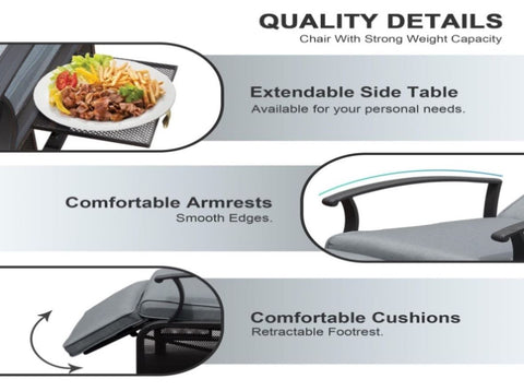 Exquisite Side Table Integration: Experience the seamless convenience of the built-in side table. Effortlessly elevate it for instant access to your indulgent treats, beverages, and cherished reading materials, ensuring a touch of opulence in your outdoor relaxation.