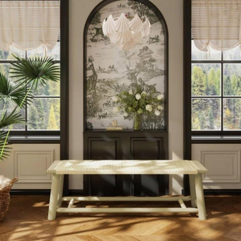 Designed for breezy porches, sunrooms, or cozy dining nooks. This bench blends handwoven rattan seating with tapered solid wood legs, offering a farmhouse-modern aesthetic adaptable to covered patios or airy living spaces.