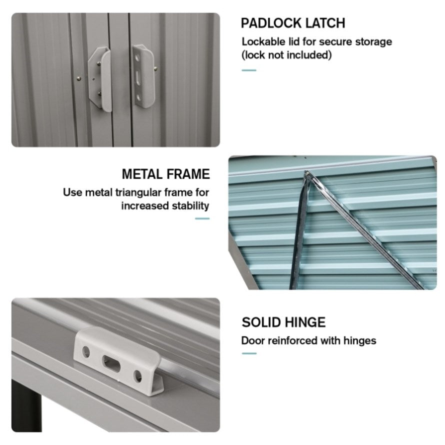 - [Ventilated and Lockable bin Shed]It is equipped with individually opening doors at the front and black plastic door handles. So, the bins can be easily removed and emptied. The storage shed has individually lifting lids which can be opened to deposit rubbish easily.