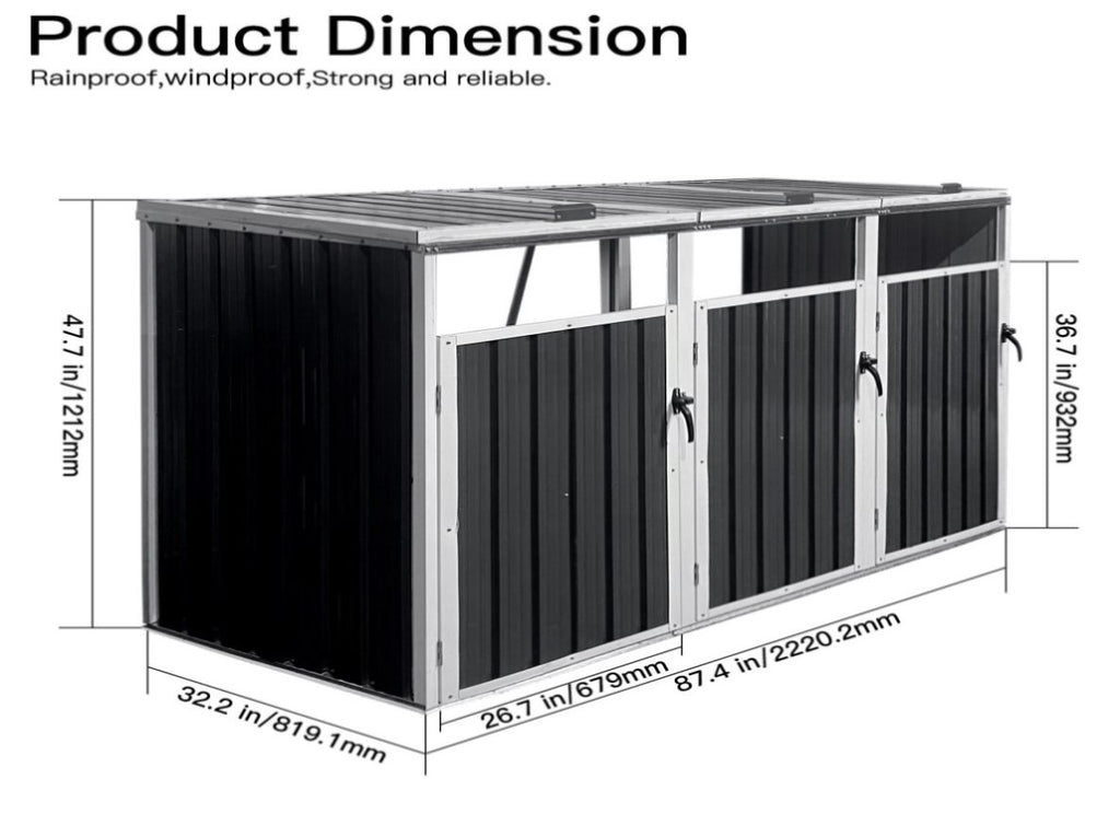 [Ventilated and Lockable bin Shed]It is equipped with individually opening doors at the front and black plastic door handles. So, the bins can be easily removed and emptied. The storage shed has individually lifting lids which can be opened to deposit rubbish easily.