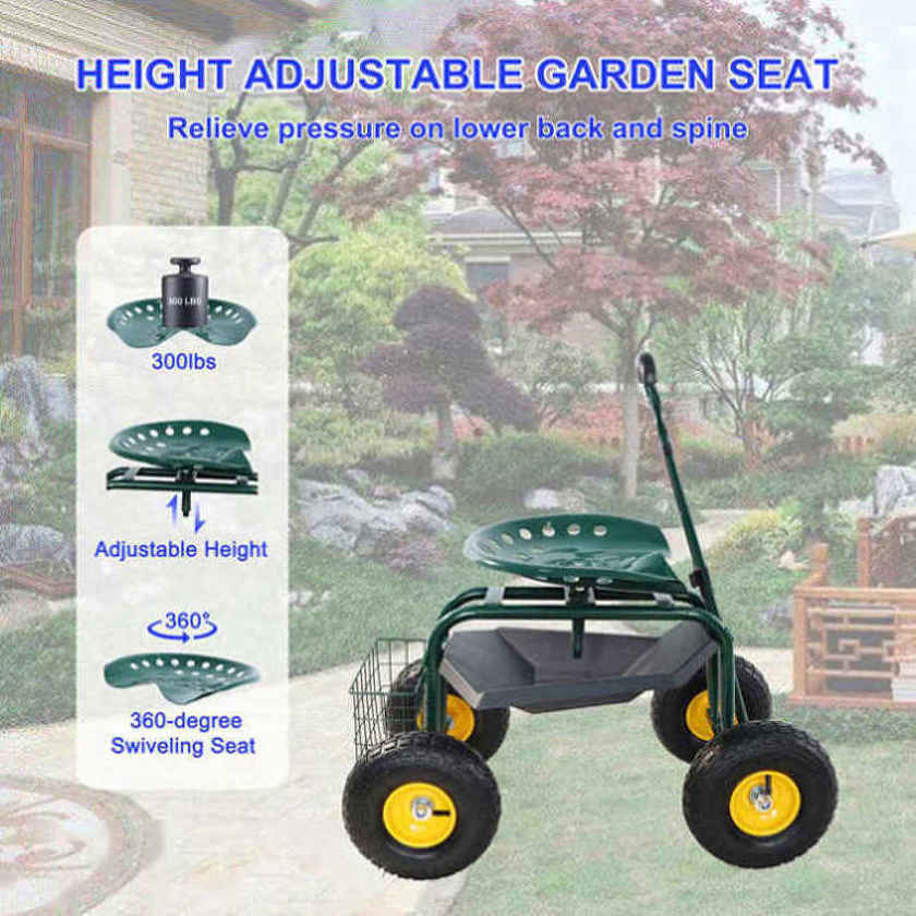 Comfortable and Ergonomic Design:Our garden cart boasts a comfortable swivel seat that is both height adjustable and provides 360-degree swivel motion. Experience optimal comfort and flexibility during long hours of use. Effortlessly rotate the seat in any direction to access different areas of your garden, making your gardening sessions more enjoyable.