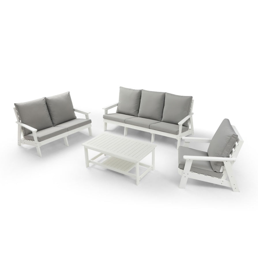 This outdoor sofa set features HIPS frames that are lightweight and easy to move, making it suitable for various settings such as patio, poolside, and garden. With a heat-treated wood grain coating, they offer the natural look of wood without the maintenance, bringing both style and comfy