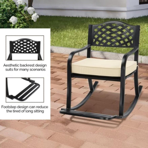 3.Stable Construction - Engineered with reinforced cast iron construction, this rocking chair guarantees rust-proof durability and rock-solid stability. The ultra-smooth finish withstands harsh weather while maintaining like-new appearance season after season