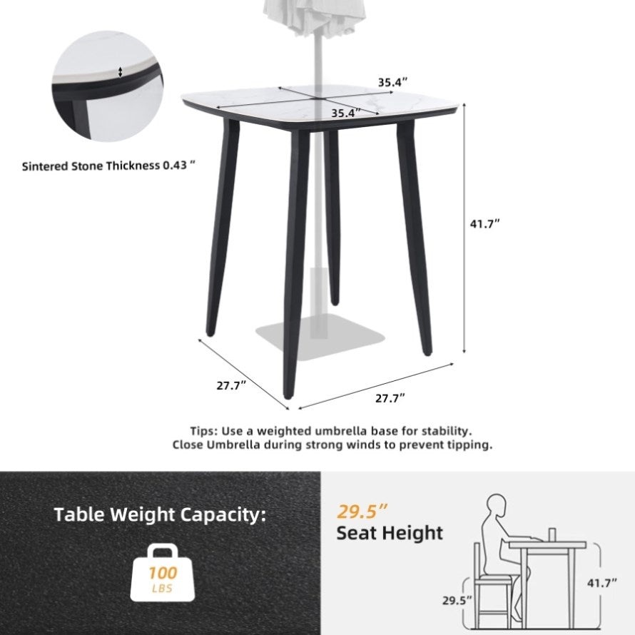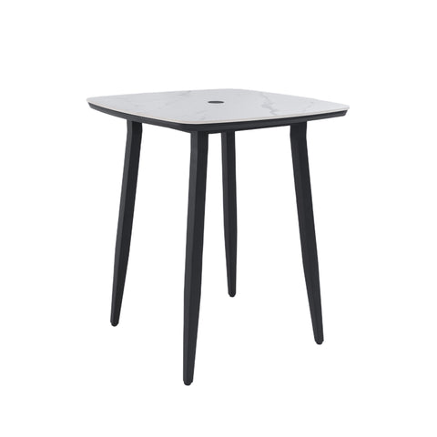 Upgrade your outdoor space with this 35.4'' square bar-height table, designed for both style and durability. The Greek White marble-inspired sintered stone tabletop features a sleek squircle shape with smooth edges and rounded safety corners. Built for all-weather use, the rust-free aluminum frame with an Ember Black finish ensures strength and longevity. A built-in 2'' umbrella hole with an aluminum cap allows for optional shade. Tapered legs with adjustable foot pads provide stability on uneven surfaces. Perfect for patios, balconies, and poolside settings, this modern bistro table enhances any outdoor space.