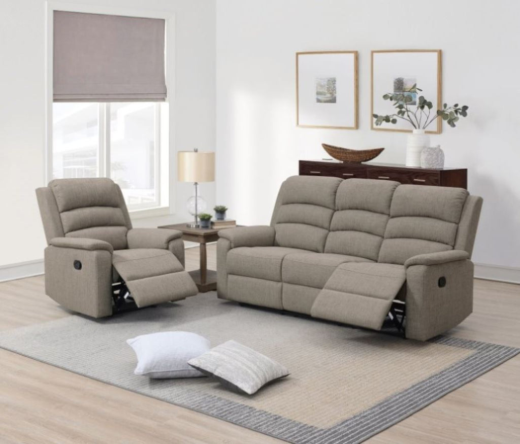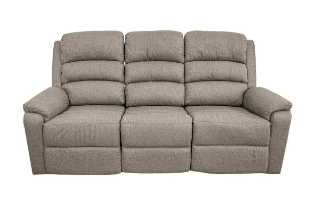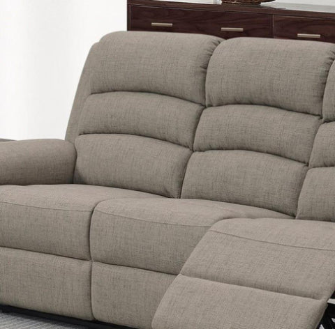 Relax with the family and enjoy a movie night with this 3-seater manual recliner. Designed to provide maximum comfort and support, featuring patted headrests and armrests. Available in Light Brown and Dark Gray (Burlap Fabric) Product Dimensions:-