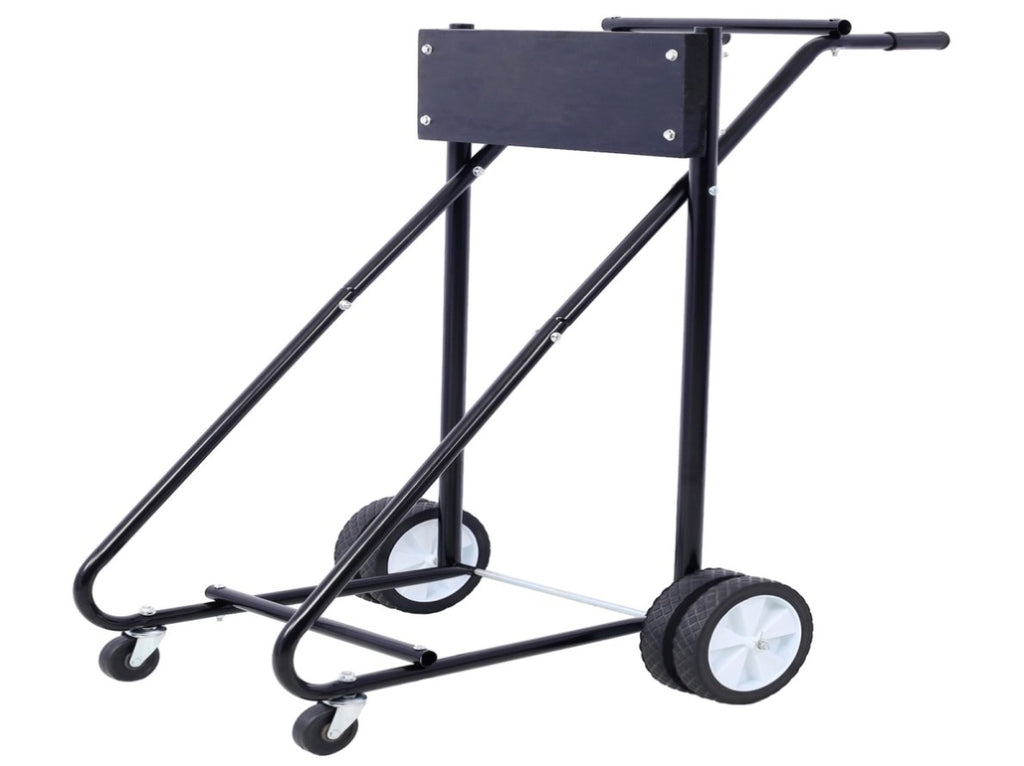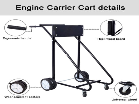 STEEL CONSTRUCTION: Crafted with durable steel tubes, our boat motor cart is built to last. it can hold up to 315lbs, providing reliable support for your outboard motor. The hanging board is constructed with solid wood, ensuring even greater strength and stability. WHEELS FOR EASY MOBILITY: Our boat motor cart features 2 universal front caster wheels and 2 rear wheels, each composed of 2 single wheels. This design allows for smooth and effortless movement, making it easy to transport your outboard engine wherever it's needed. VERSATILE USAGE: Designed with versatility in mind, our boat motor cart is perfect for various applications. Whether you need to store, maintain, or transport your outboard engine in the garage, this cart is up to the task. It provides a convenient and reliable solution for holding your outboard motor during repairs or maintenance. ASSEMBLY REQUIRED: Some assembly is required for the boat motor cart. The overall dimensions of the cart are approximately 28.9'' W x 42.5'' D x 42'' H. We recommend not fully tightening the screws until all parts are properly aligned, ensuring a secure and stable assembly. ERGONOMIC HANDLE: Equipped with two ergonomic handles, our boat motor cart allows for comfortable and convenient steering and movement. With these handles, you can effortlessly navigate the cart around your garage, providing ease and convenience during use.