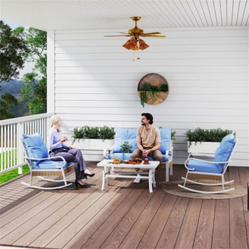 - - PE wicker patio furniture set with 2 rocking chairs, a 2-seat sofa, and a table
