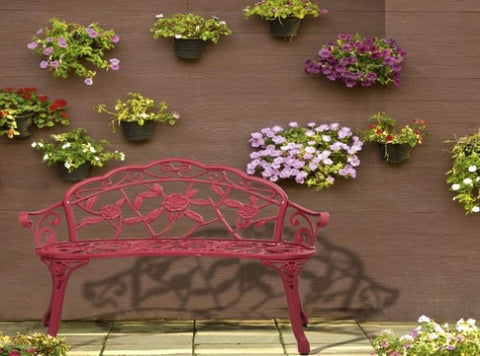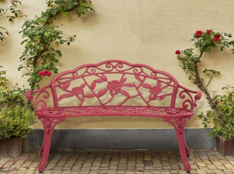 Outdoor Cast Aluminum Patio Bench, Porch Bench Chair with Curved Legs Rose Pattern, Red 57565215