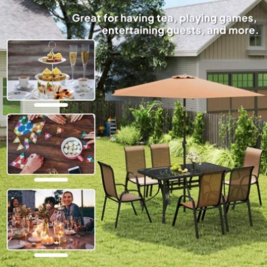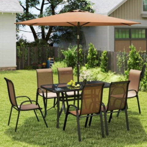 - - Outdoor furniture set consisting of a patio table, six chairs, and an umbrella