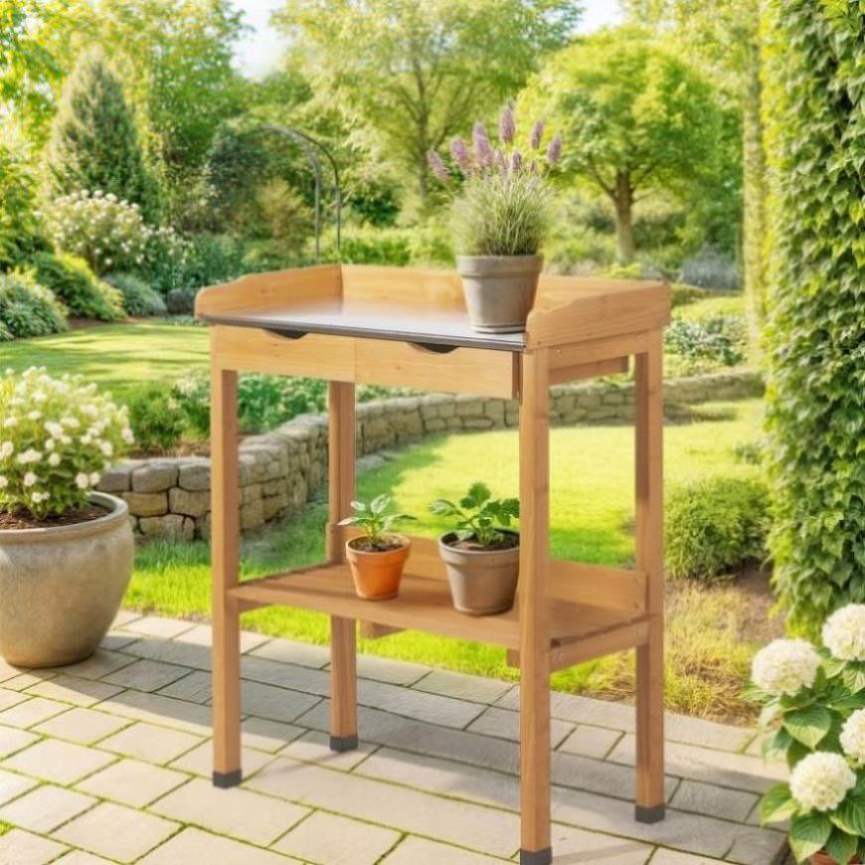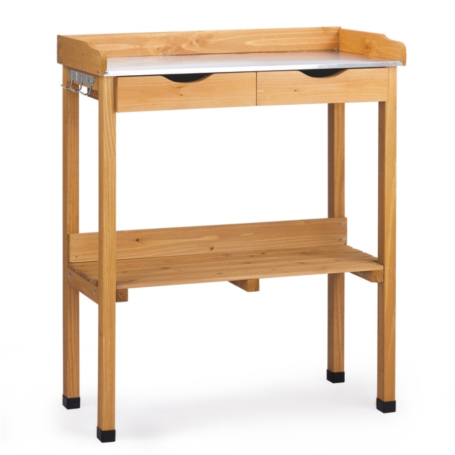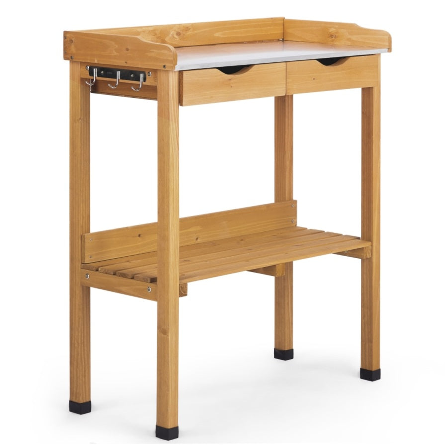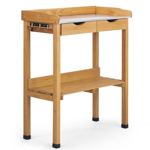 Create a more efficient and enjoyable gardening experience with this Outdoor Garden Potting Bench Table. Designed for both seasoned horticulturists and backyard hobbyists, this versatile workstation features a weather-resistant metal tabletop that's easy to clean and perfect for messy garden tasks. With natural fir wood construction, it adds rustic charm to any garden, patio, or greenhouse. Offering ample storage with drawers, shelf, and hooks, this potting bench keeps your tools and supplies organized and within reach. Whether you're repotting plants or prepping garden beds, this bench provides the durability and convenience you need.