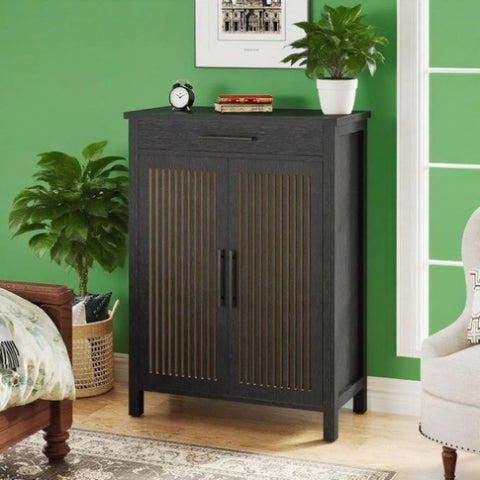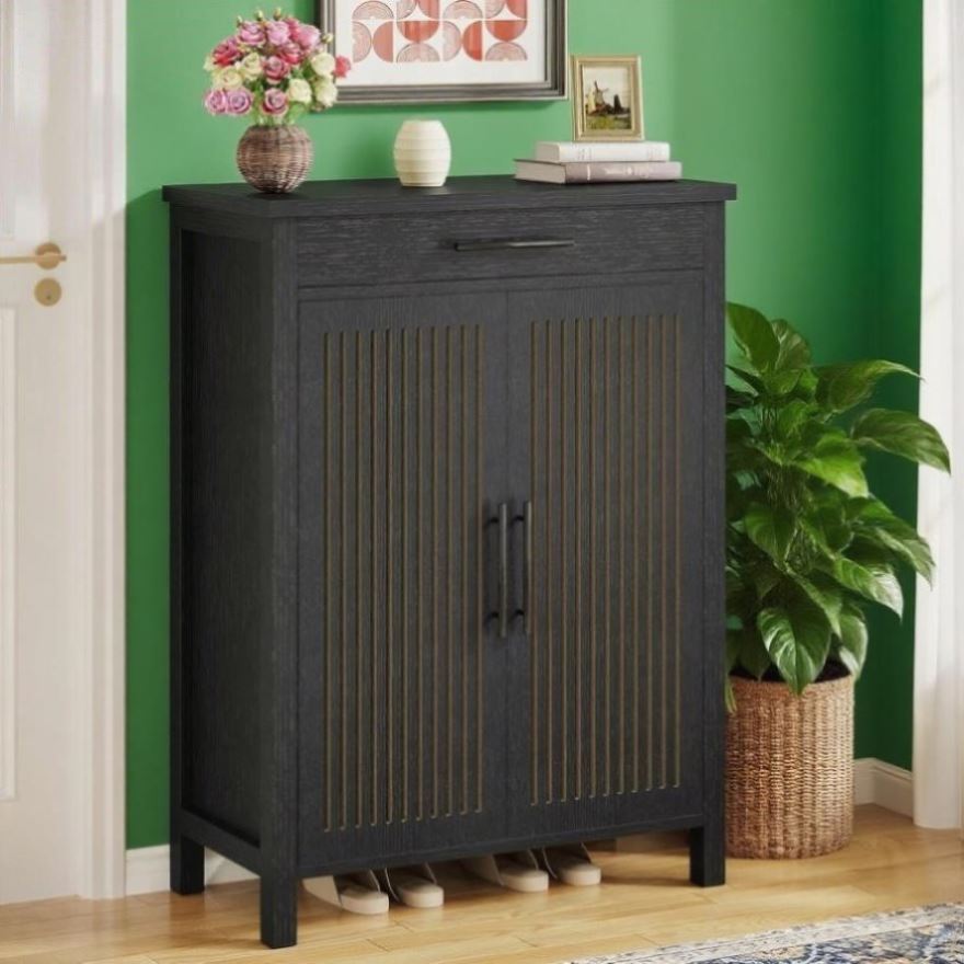 Louvered Door Design: Harmonizing vintage allure with contemporary style, this entryway shoe cabinet features two louvered doors for satisfactory air circulation and excellent shoe storage. Its stylish black finish adds timeless charm to your home