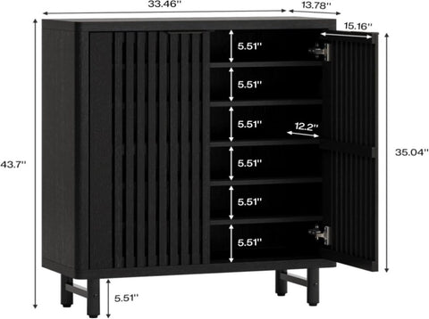 • 【Spacious Storage Solution】Measuring 33.46" W x 13.78" D x 43.31" H, this shoe cabinet offers generous storage. The wide countertop accommodates keys, bags, and daily essentials, while the open lower shelf suits house shoes and robot vacuums. Inside, six tiers with adjustable partitions maximize space efficiency for versatile storage