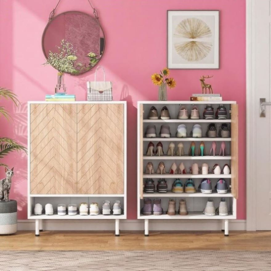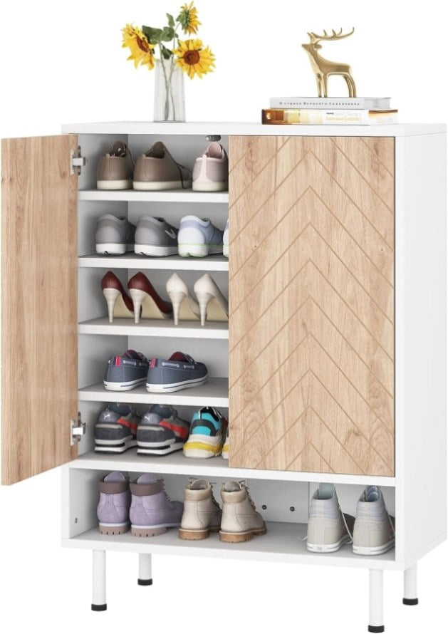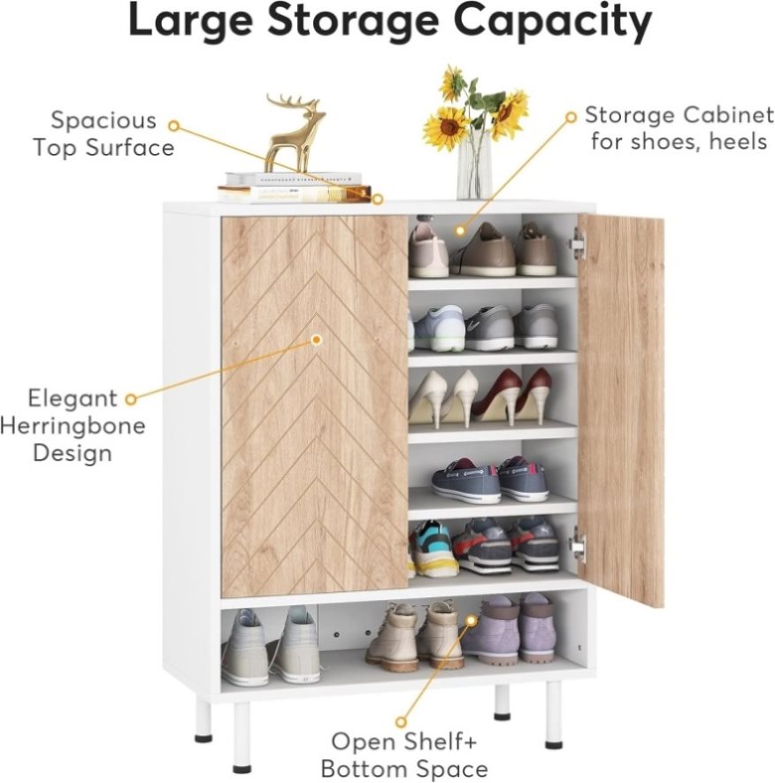 Rustic Modern Shoe Cabinet: Modernist or love an industrial twist? Try our shoe organizer! Rustic wood doors with beautiful herringbone design meet the clean white frame that makes a statement in your space while making your future guests with a "wow!" This shoe storage brings sleek style and smart storage to your entryway, bedroom, or dressing area