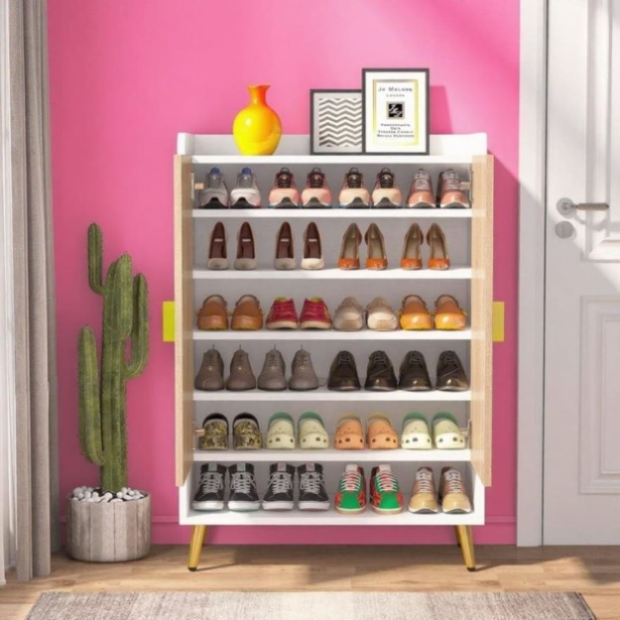 • SOLID CONSTRUCTION: Say goodbye to the flimsy and cheap shoe stand closet shoe rack. Made of premium E0 MDF, our entryway shoe cabinet with solid construction that would not make your shoes wobble or even let them down; 0.59” thicker boards enable this shoe organizer to load much heavier items, and making the rack more durable while using.