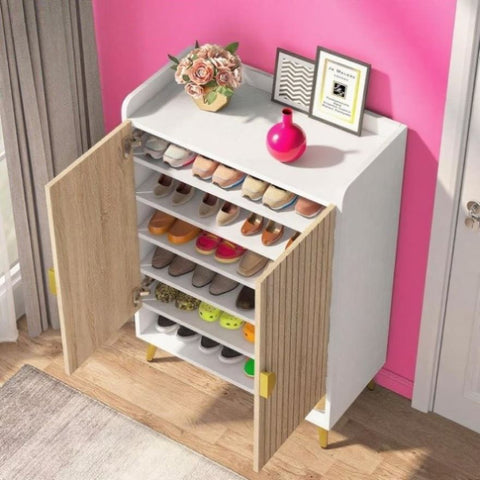 • ELEGANT HOME DECOR: Crafted with wooden board and finely polished with water-proof and wear-resistant white paint, this eye-catching shoes cabinet with doors will impress your friends deeply when they enter your home. Sleek white with golden metal handles and legs, adds a warm touch and some modern flair, to be decorative enough to suit any corner of your house.