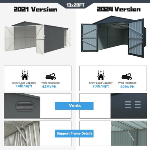 Walk-in Huge 13 X 20 FT Storage Shed: This outdoor shed offers 240 sq. ft floor space for your truck car, large-size tools, lawn equipment, and bicycles to store. With a hinged front double door and side door, you can drive in or walk into the shed so easily. Also, the doors with lock holes, ensure organization safety.
