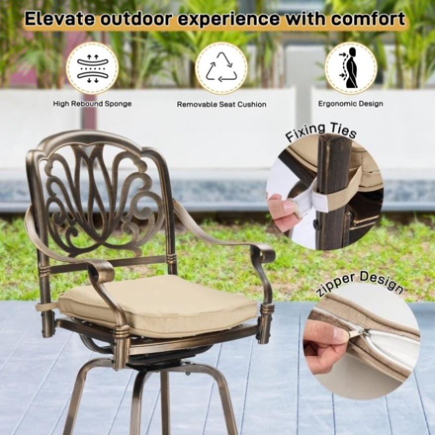 360-Degree Swivel Functionality: Smooth-rotating bases of the aluminum chairs allow seamless directional movement, perfect for socializing or dynamic seating arrangements. This feature enhances convenience in patios, poolsides, or dining areas.