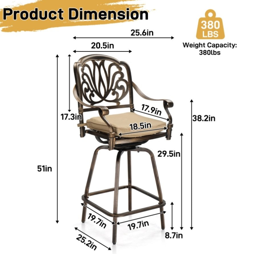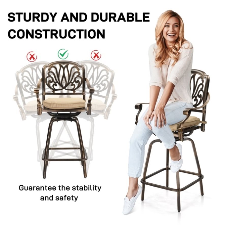 Durable Construction: Crafted from rust-resistant cast aluminum or steel frames and UV-resistant coatings, these bar stools withstand outdoor elements like rain, sun, and corrosion. Waterproof fabrics and antioxidation treatments ensure longevity, while high weight capacities (up to 380 lbs) support robust use.