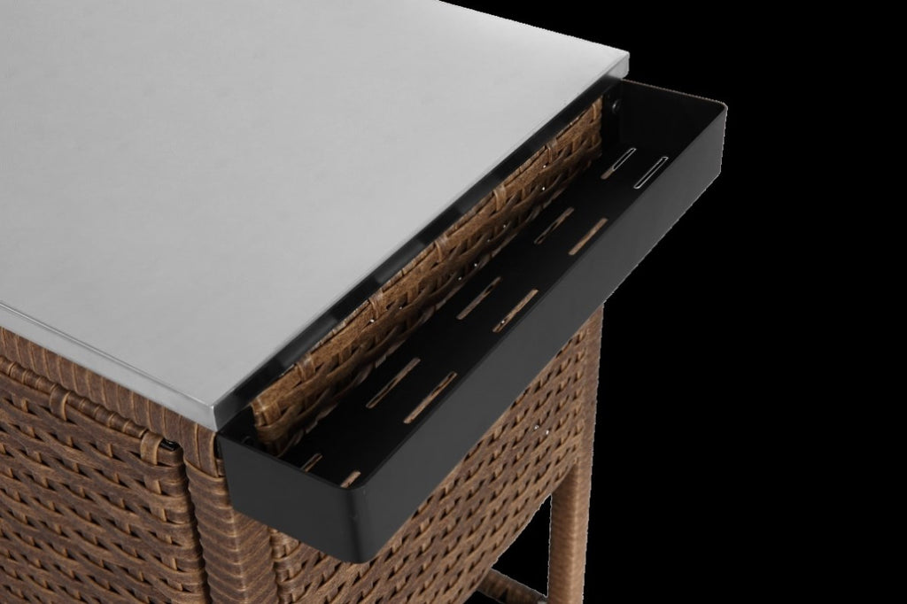 This rattan outdoor kitchen table features a solid steel frame that's covered in weather-resistant handwoven wicker; Stainless steel countertops are better for outdoor use; Can withstand diverse weather conditions to achieve long-lasting use