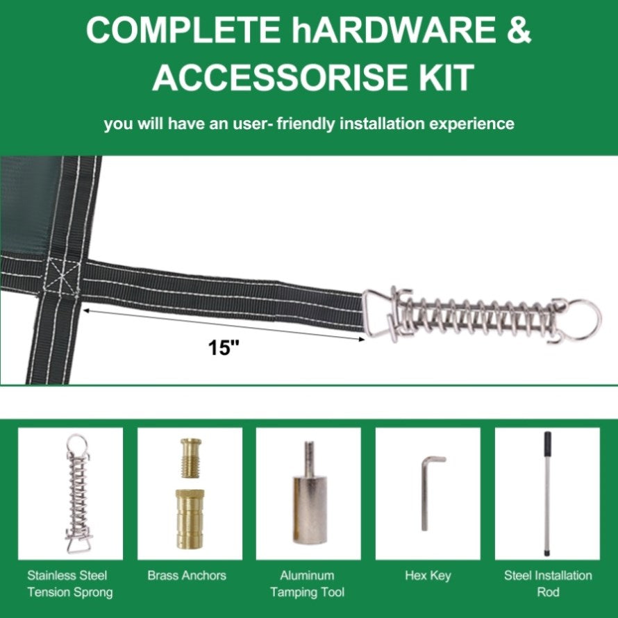 Complete Hardware Kit for Easy Installation: The pool cover comes with all the necessary hardware for a simple and quick installation. The package includes brass anchors, stainless steel springs, and all required installation tools. With a drill and tamp brass anchoring system designed for concrete and an adjustable rope length, setup is straightforward and adaptable to different pool configurations.