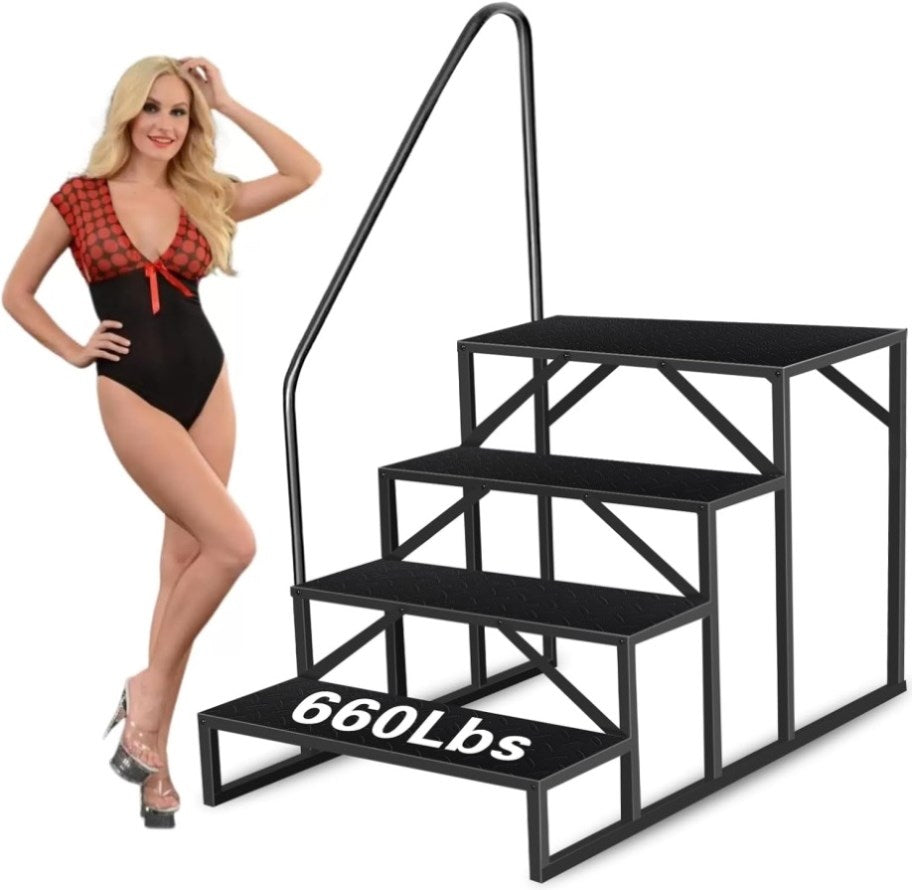 【Heavy Duty Portable Steps】The weight of our 4 step is 48.5 pounds, the capacity of our metal step is 660 pounds. With 1.8mm thickness iron anti-slip platform, the safety spa stairs is durable than wooden plastic or adjustable foldable. Hot tub stairs can withstand a lot of weight. We have made some load-bearing experiments, and many adults stand on the mobile home stairs, the step stairs are stable. Porch step for house outside is designed for small to medium-sized above-ground pools, backyard pools, and stock tank pools